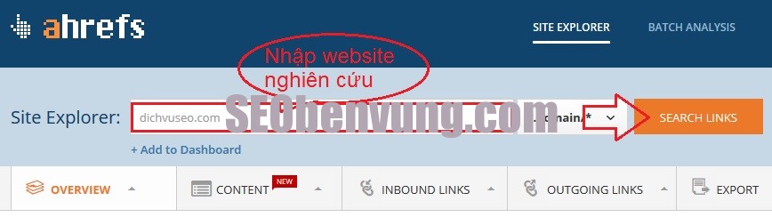 Phần Site Explorer các bạn nhập địa chỉ website nào muốn tìm hiểu sau đó bấm Search Links để ahrefs.com trả về những gì mình cần. Đó là tìm hieu chức năn aherfs
