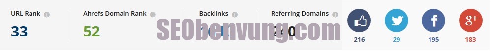Tiếp theo theo là những hình bên tay phải các bạn đó là thông số bao gồm thông số đầu tiên đó là website này có 216 like, có 29 tweets qua Twitter , sau đó là 195 lượt share qua facebook, và cuối cùng là 183 lươt + qua google plus.