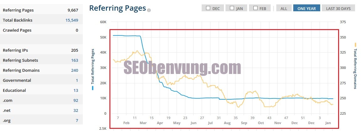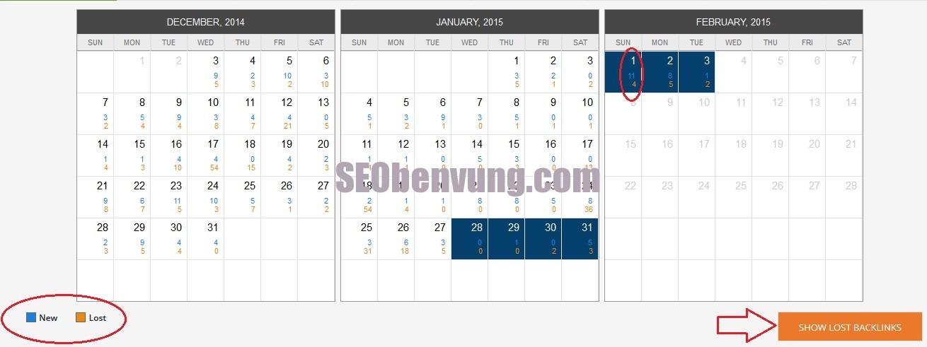 Số mầu xanh thông báo bạn rằng website có bao nhiêu back link mới được xây dựng, phần mầu vàng thông báo với với bạn rằng bao nhiêu back link bị mất, Mình lấy ví dụ ngày 1/2 năm 2015 website này có 11 back link mới được xây dựng, và bị mất 4 back link đi, muốn xem chi tiết các backlink nào mất các bạn có thể bấm vào SHOW LOST BACKINGS để biết chi tiết.