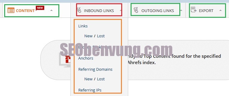 Chúng ta có thể thấy chi tiết các backlink bị mất, các bạn có thể xem chi tiết các back link mới cũng được, Tiếp theo rất nhiều chức năng khác nữa như Content, Outgoing link, và nếu cần bạn có thể xuất các thông số đó ra file excel để các bạn tham khảo và nghiên cứu thêm.