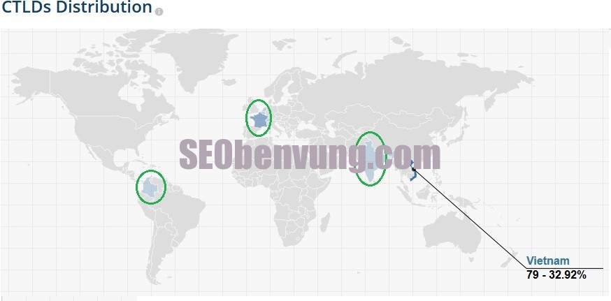 Đây là tổng số tên miền cho mỗi nước có liên kết đến đến website mà ở đây là tên miền chúng ta đang nghiên cứu làm vidụ đó dich vu seo ( hoặc bất kỳ tên miền phụ ) . Chúng ta di chuột qua một quốc gia cụ thể để xem tổng số lĩnh vực và nó chiếm bao nhiêu % , thường thì các quốc gia nào có nhiều nó sẽ sáng lên, các bạn có thể xem hình bên dưới.