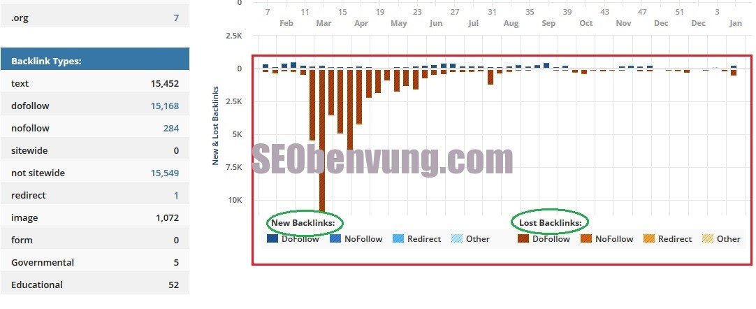 Với hình trên chúng ta có thể thấy được các loại back link của dichvuseo.com hơn nữa chúng ta còn biết chi tiết các ngày được thêm back link và đã mất back link như thế nào, với các tông mầu như vậy các bạn có thê biết được ngày 12/5 website dich vu seo mất rất nhiều back link dofollow, mà link dofollow cực kỳ quan trọng đối vơi website, còn nofollow có cũng được mà không có cũng trả sao.