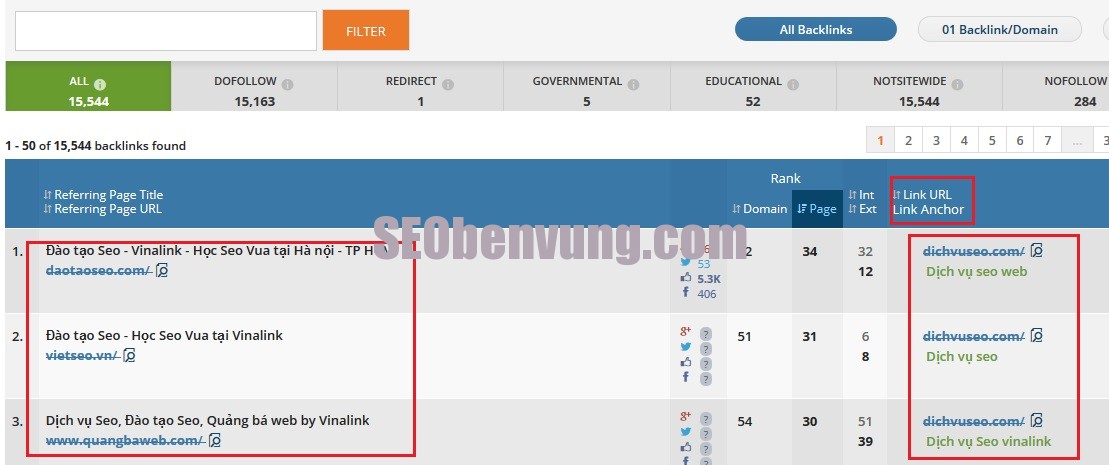 Chúng ta thấy rất nhiều thông tin ở đây, mình xin điểm qua môt chút đó la website nào, tiêu đề chính của website đó, tức là các từ khóa chính của website đó, bên tay phải các bạn thì đó link địa chỉ website, cùng với từ khóa để kết nối đến website, tức là từ khóa nào được liên kêt đến link nào, ví dụ như giup viec nha theo gio, hay lắp đặt camera quan sát quận đống đa… rất chi tiết còn một số thông tin của website đặt back link như lượng like trên face, lượng chia sẻ trên Face nữa, rồi các liên kết bên trong và bên ngoài của website mà đã đặt back link, nói chung rất nhiều thông tin chi tiết vê website mà đã đặt back link. Hiện tai bản miễn phí chỉ cho phép hiện thị vị trí từ 1-5 từ vị trí thứ 6 đến hết thì các bạn phải dùng bản pro tức là bản mất phí thì các bạn sẽ xem được hết.